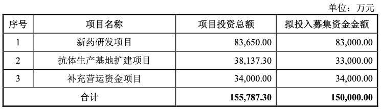 公司此次拟募集资金15亿元,其中8.3亿元拟用于新药研发项目,3.3亿元拟用于抗体基地扩建项目,3.4亿元拟用于补充流动资金。