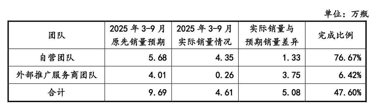 数据显示,外部推广服务商团队2025年3-9月原先销量预期为4.01万瓶,但实际销量情况仅为0.26万瓶,完成比例只有6.42%。